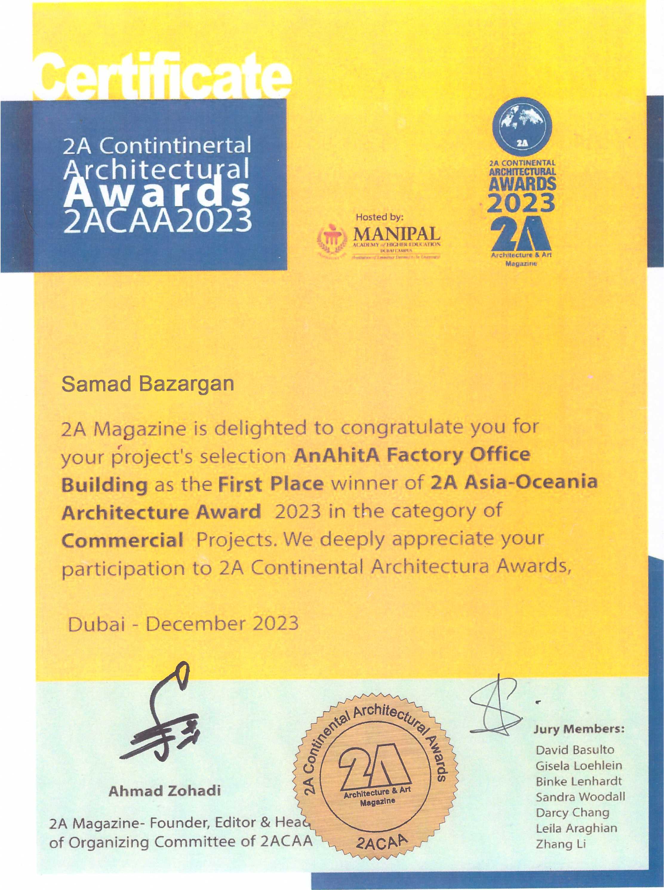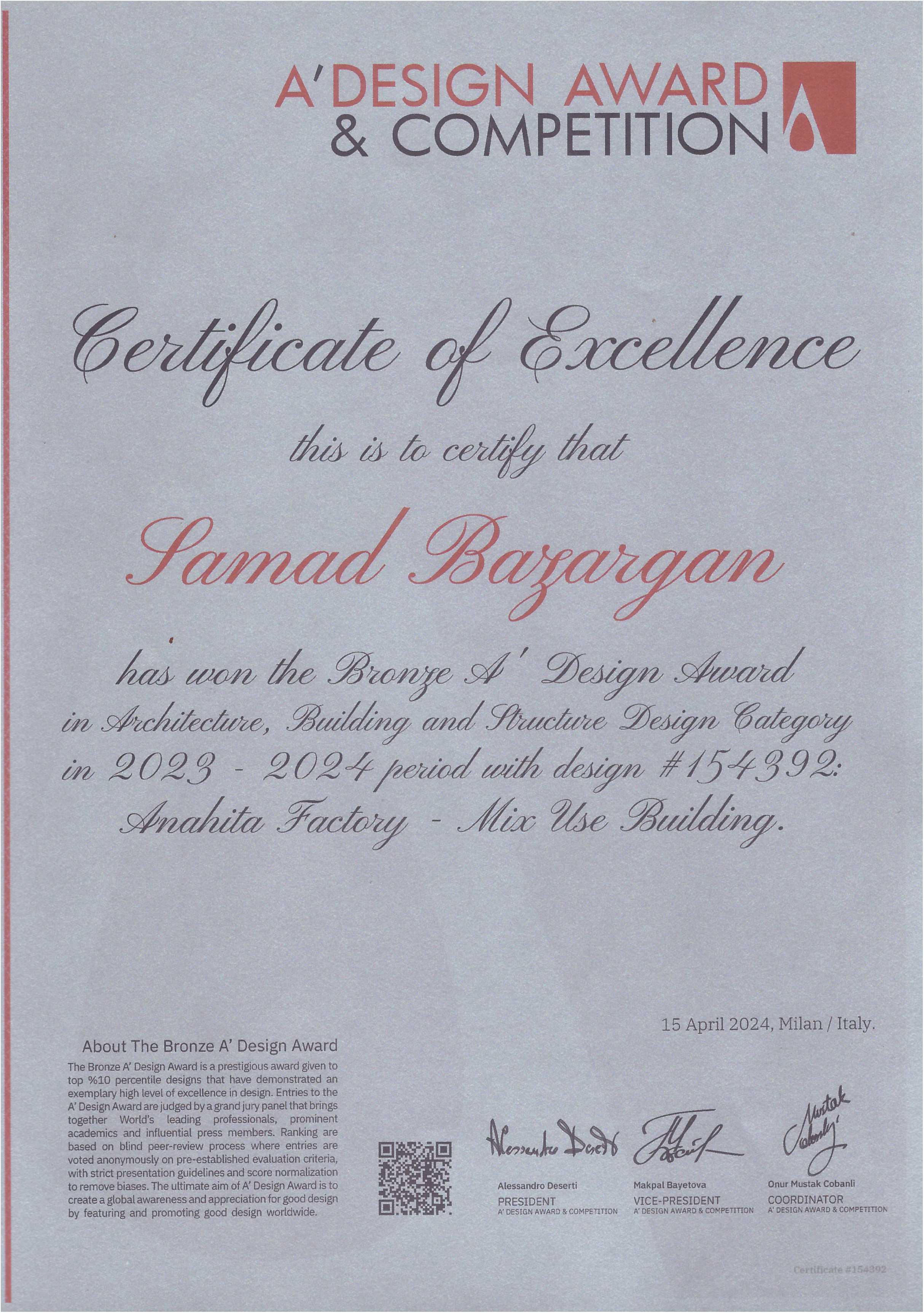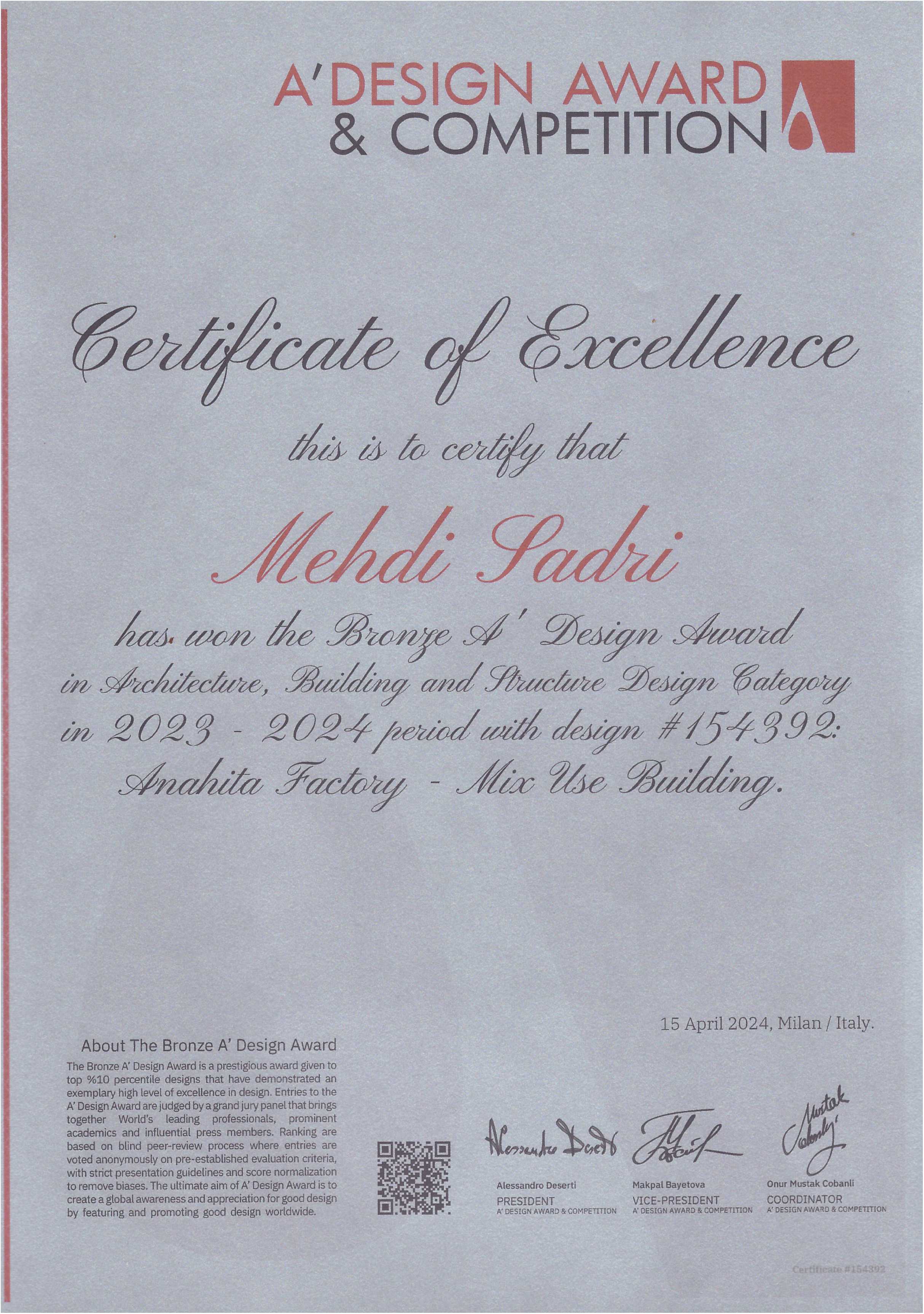 مقام سوم مسابقات جهانی A'Design ایتالیا در بخش ساختمان های ساخته شده